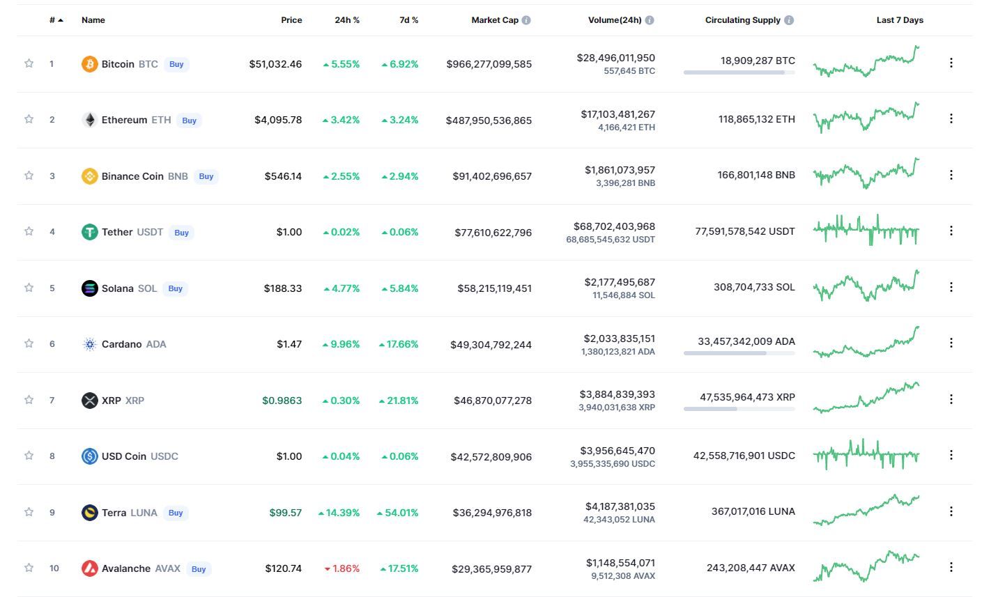 Лучший результат в топ-10 самых капитализированных криптовалют за сутки (+14,39%) и неделю (+54,01%) зафиксирован у Terra. Все криптовалюты, за исключением Avalanche, продемонстрировали позитивную динамику в рамках 24 часов и последних 7 дней.