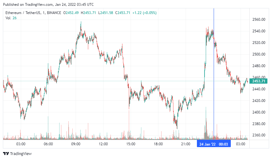 Вторая по капитализации криптовалюта Ethereum также начала понедельник с падения. По состоянию на момент написания новости монета торгуется по $2453.