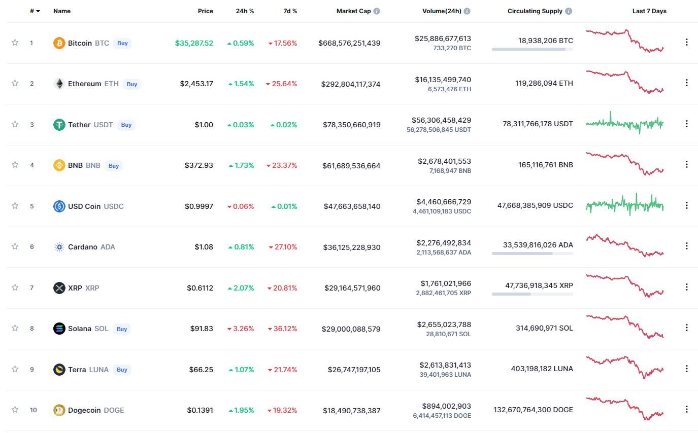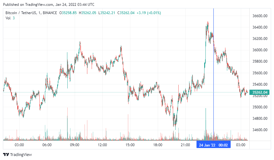 Биткоин (BTC) начал новую рабочую неделю с коррекции. По состоянию на 06:35 (МСК), криптовалюта торгуется по $35 262. Минимум стоимости биткоина за 24 часа, по данным ресурса CoinMarketCap, зафиксирован на уровне $34 784, максимум – на высоте $36 433.