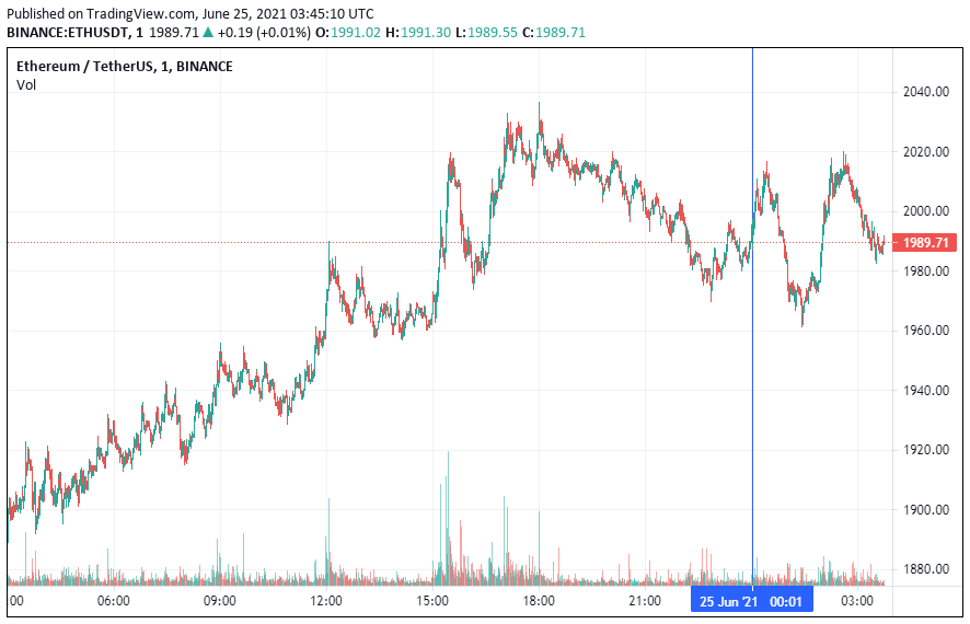 SponsoredВторая по капитализации криптовалюта – Ethereum – последовала примеру биткоина, начав день с роста. По состоянию на момент написания новости, монета торгуется по $1989.