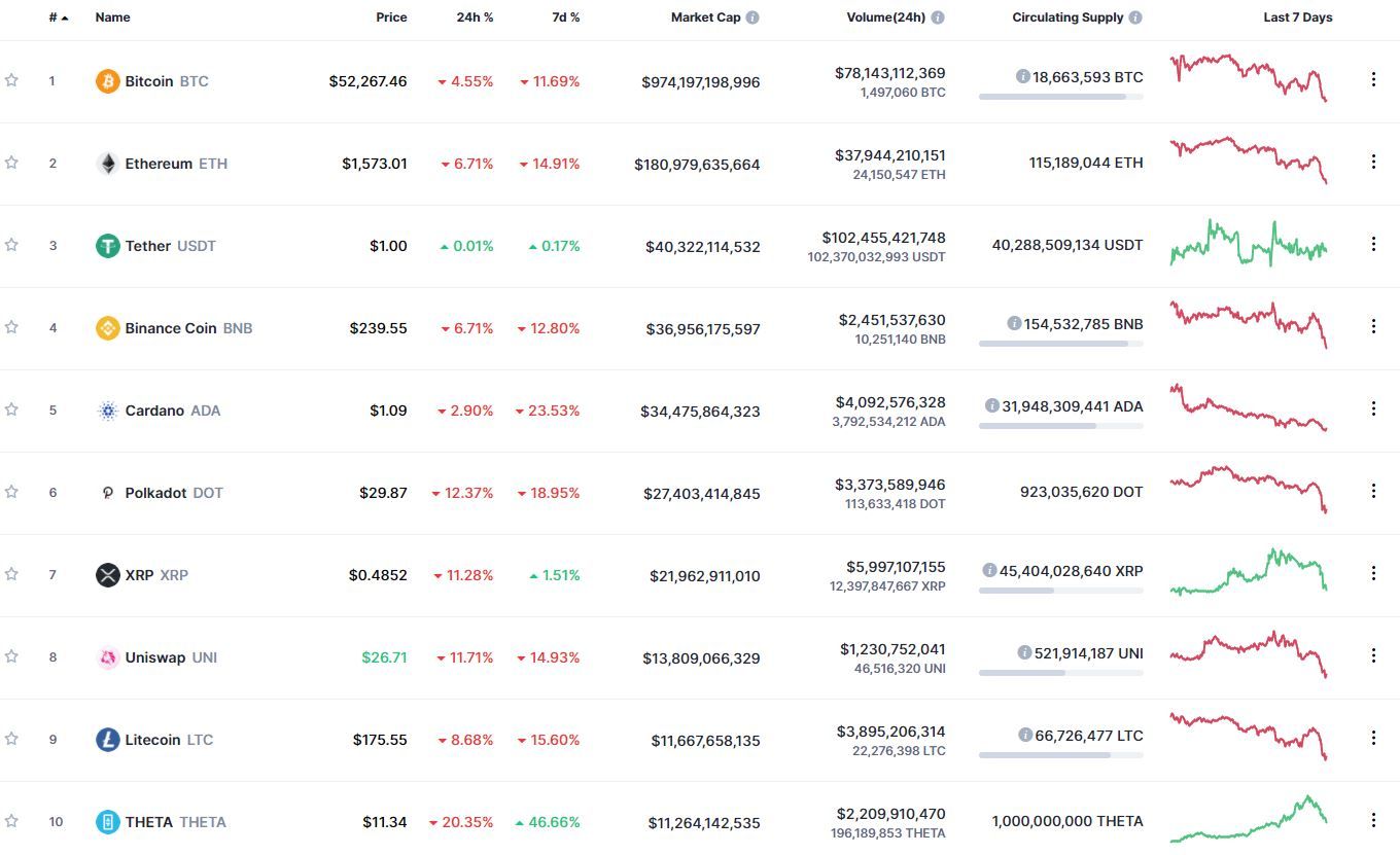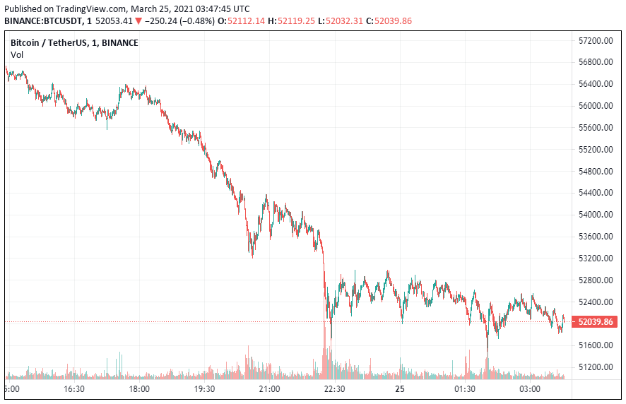 Самая капитализированная криптовалюта – биткоин (BTC) – начала четверг с падения. По состоянию на 06:48 (МСК), по данным ресурса CoinMarketCap монета торгуется по $52 267. За сутки криптовалюта потеряла 4,55%, за неделю – 11,96%.