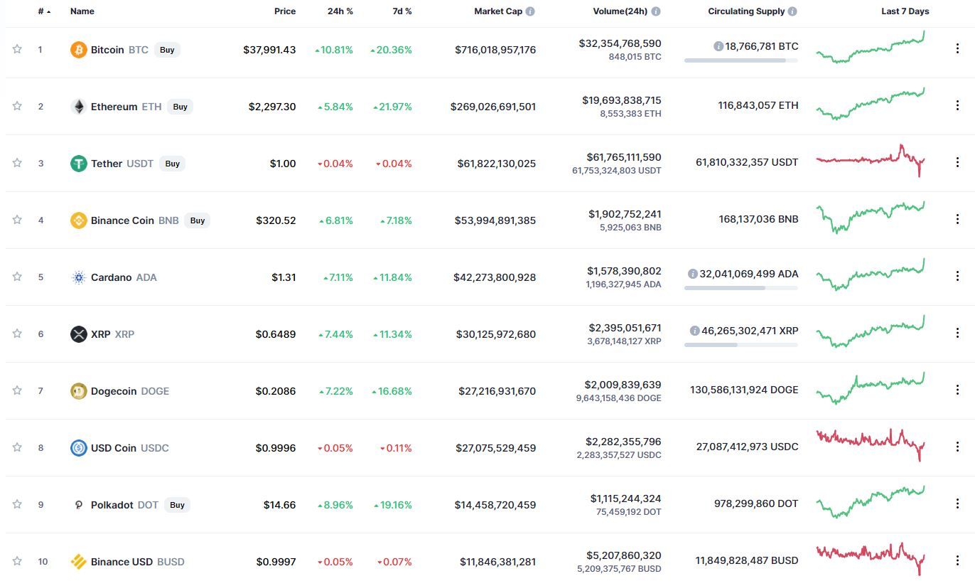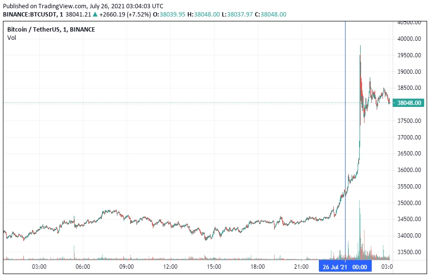 Биткоин (BTC) начал новую рабочую неделю с резкого роста. В моменте криптовалюта попыталась прорвать уровень $40 тыс., после чего монета вышла в коррекцию. По состоянию на 06:05 (МСК), биткоин торгуется по $38 048.
