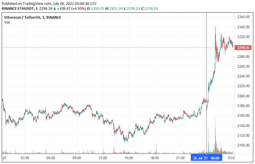 Вторая по капитализации криптовалюта – Ethereum – также начала понедельник с роста. По состоянию на момент написания новости, монета торгуется по $2298.
