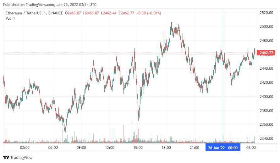 Вторая по капитализации криптовалюта Ethereum начала день с бокового движения. По состоянию на момент написания новости монета торгуется по $2462.