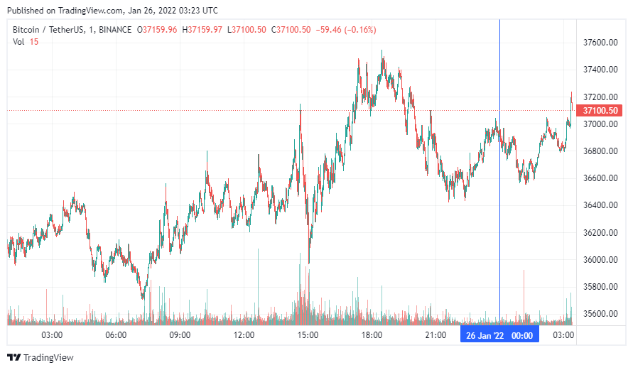 Биткоин (BTC) начал среду с небольшого роста. По состоянию на 06:24 (МСК), криптовалюта торгуется по $37 100. Минимум стоимости биткоина за 24 часа, по данным ресурса CoinMarketCap, зафиксирован на уровне $35 779, максимум – на высоте $37 444.