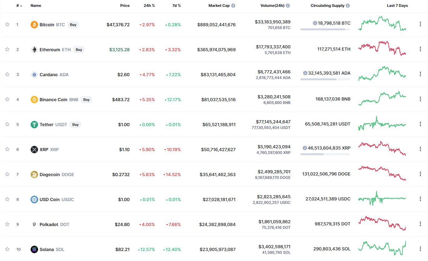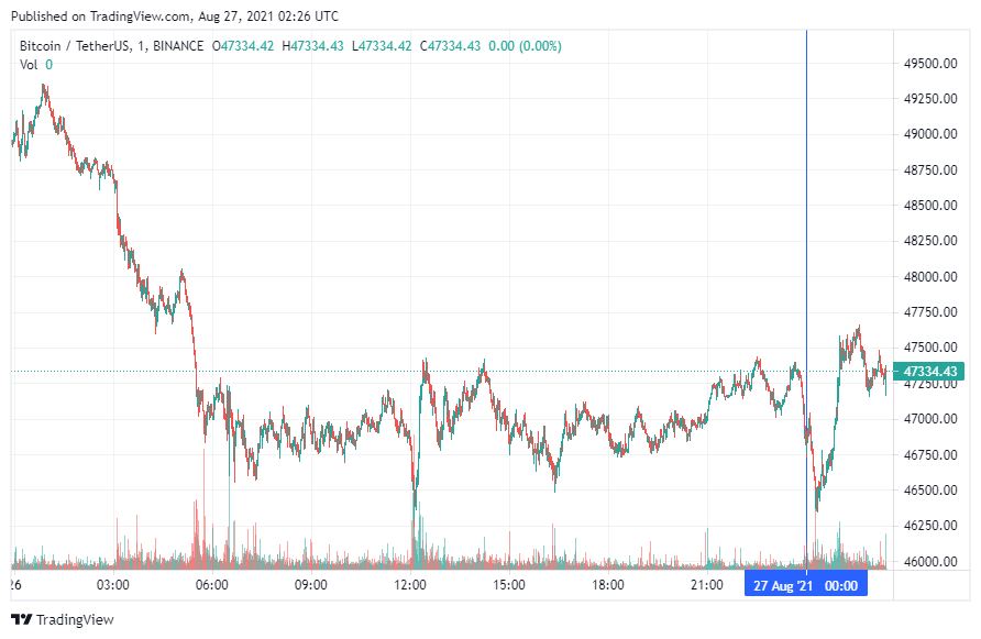 Биткоин (BTC) начал последний день рабочей недели с падения, которое перешло в коррекцию. По состоянию на 05:27 (МСК), монета торгуется по $47 334. Максимум стоимости криптовалюты за сутки, по данным CoinMarketCap, зафиксирован на уровне $48 710, минимум – на высоте $46 394.