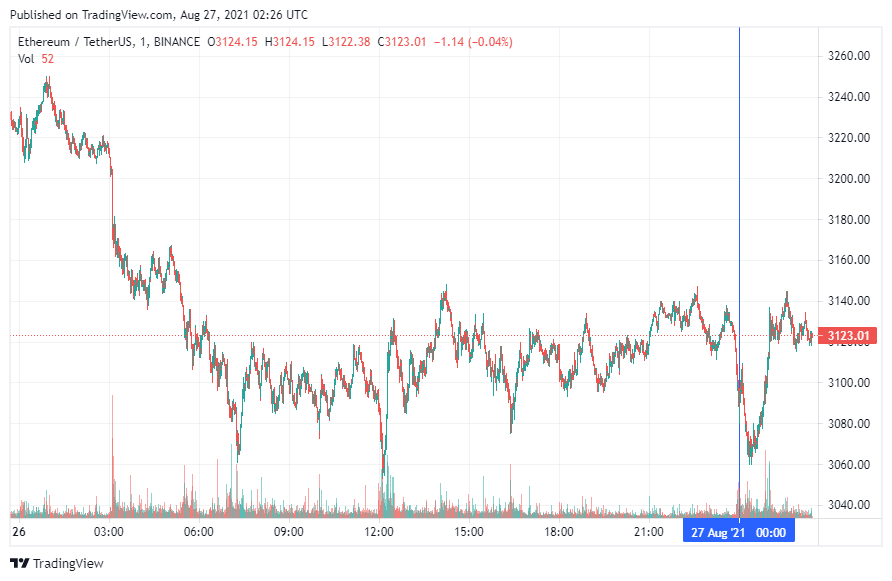 Вторая по капитализации криптовалюта – Ethereum – также начала пятницу с падения с последующим выходом в коррекцию. По состоянию на момент написания новости, монета торгуется по $3123.