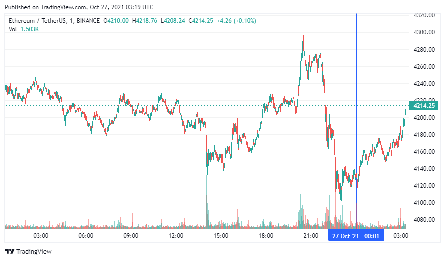 Вторая по капитализации криптовалюта – Ethereum – начала день с восстановления после вчерашнего падения. По состоянию на момент написания новости монета торгуется по $4214.