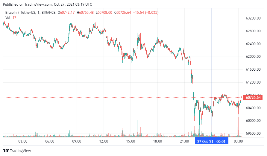 Биткоин (BTC) начал среду с бокового движения. По состоянию на 06:20 (МСК), криптовалюта торгуется по $60 726. Минимум стоимости биткоина за 24 часа, по данным ресурса CoinMarketCap, зафиксирован на уровне $59 991, максимум – на высоте $63 075.