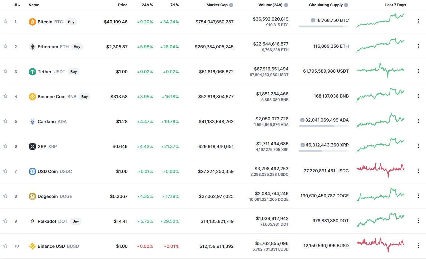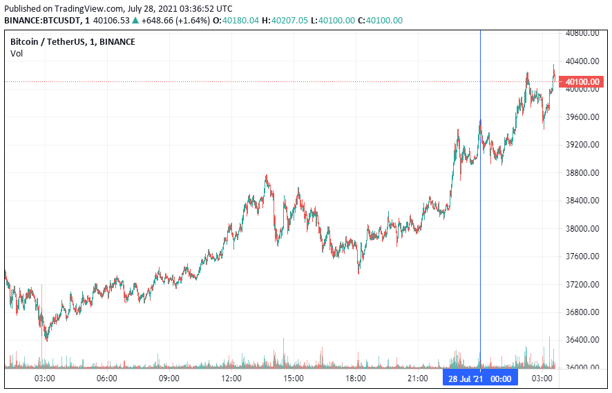 Биткоин (BTC) начал среду с роста. По состоянию на 06:37 (МСК), криптовалюта торгуется по $40 100.