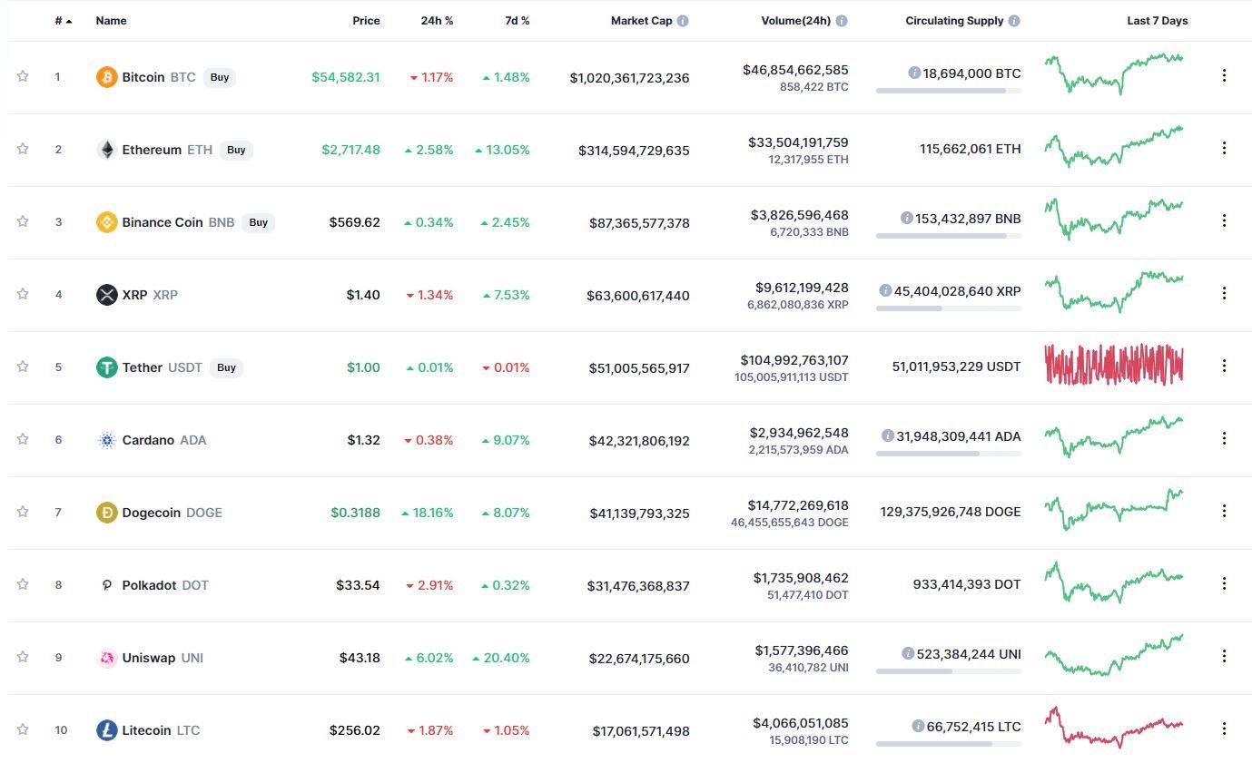 Лучший результат позитивного движения в топ-10 за сутки продемонстрировал Dogecoin (+18,16%). О причинах роста криптовалюты мы писали ранее. В течение недели лучший результат движения зафиксирован у токена Uniswap (+20,40%).