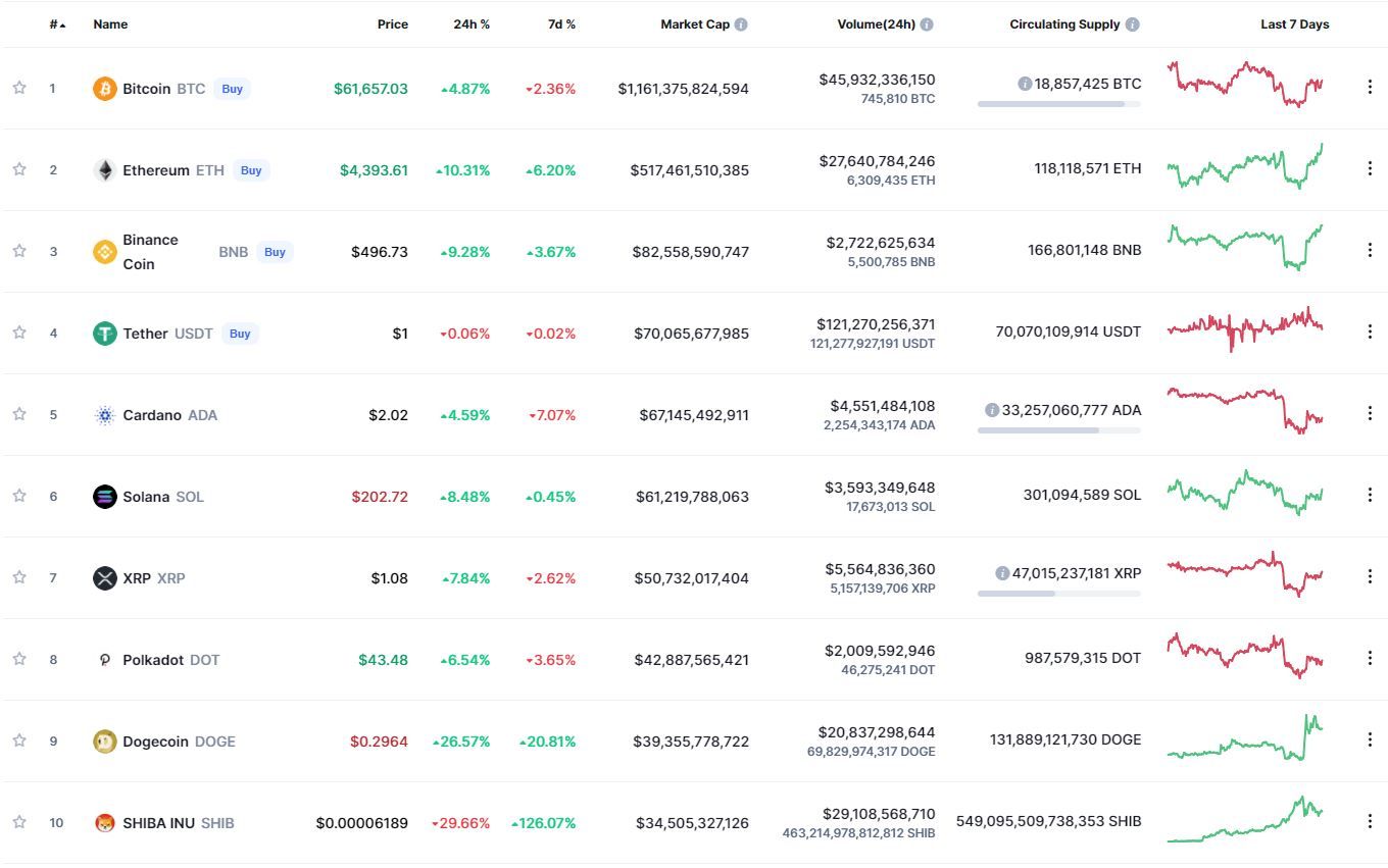В топ-10 криптовалют появилась новая монета – SHIBA INU. Криптовалюта активнее других лидеров капитализации росла в течение недели (+125,52%). При этом у SHIBA INU зафиксированы наибольшие потери за сутки (-29,66%). Лучший результат роста за 24 часа в топ-10 продемонстрировал Dogecoin (+26,57%). Наибольшие потери за неделю зафиксированы у Cardano (-7,07%).