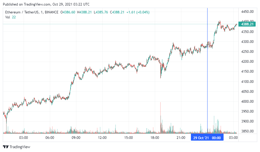 Вторая по капитализации криптовалюта – Ethereum – также начала последний день рабочей недели с роста. По состоянию на момент написания новости, цифровой актив торгуется по $4388.
