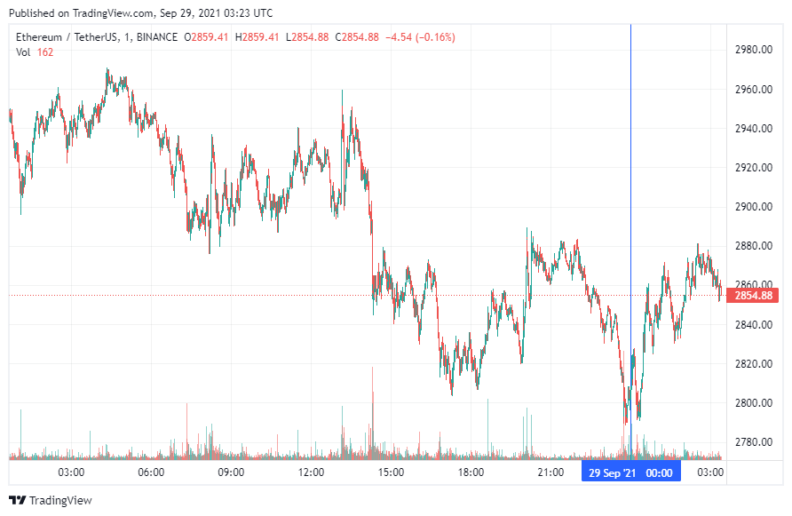 Вторая по капитализации криптовалюта – Ethereum – также начала день с роста. По состоянию на момент написания новости, монета торгуется по $2854.