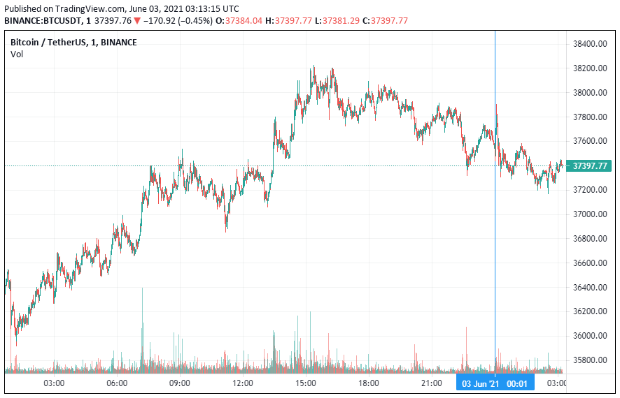 Биткоин (BTC) начал четверг с небольшой волны роста, за которой последовало падение. По состоянию на 06:14 (МСК), криптовалюта торгуется по $37 397.