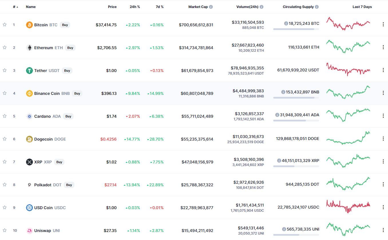 Все криптовалюты из топ-10 рейтинга капитализации ресурса CoinMarketCap, за исключением Cardano, продемонстрировали позитивную динамику движения в течение 24 часов. Лучший результат за сутки зафиксирован у Dogecoin (+14,77). Криптовалюта продемонстрировала позитивную динамику на фоне запуска торгов на Coinbase PRO. Также монета активнее других росла в течение недели (+28,70%).