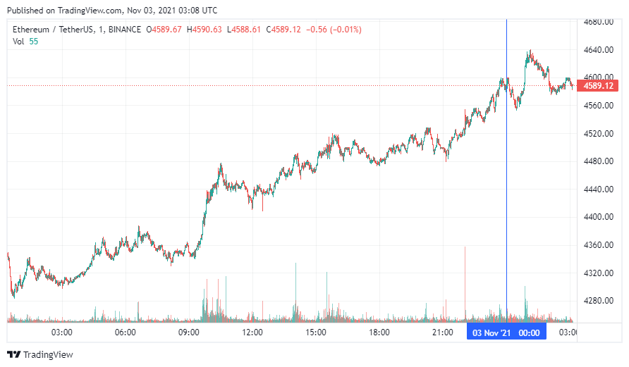 Вторая по капитализации криптовалюта – Ethereum – начала среду с обновления абсолютного максимума стоимости на высоте $4638. По состоянию на момент написания новости монета торгуется по $4589.