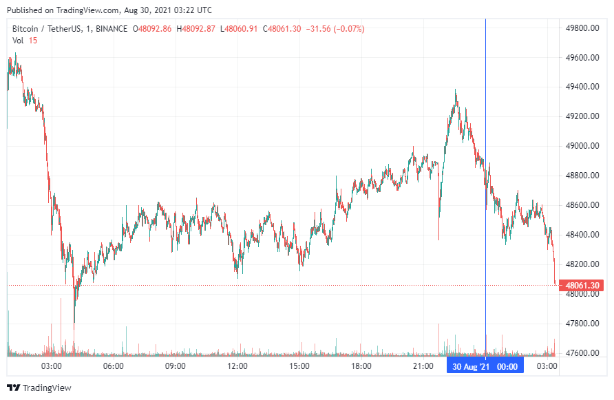 Биткоин (BTC) начал новую рабочую неделю с падения. По состоянию на 06:24 (МСК), монета торгуется по $48 061. Максимум стоимости биткоина за 24 часа, по данным CoinMarketCap, зафиксирован на $49 400, минимум – на высоте $47 925.
