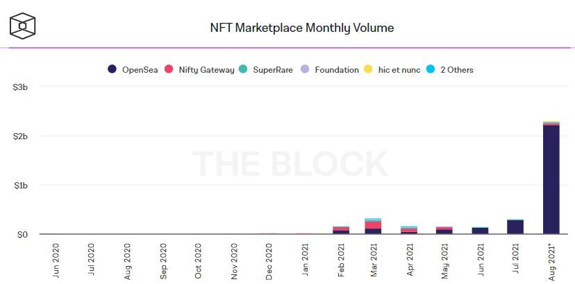 - В августе на рынке невзаимозаменяемых токенов (NFT) пользователи установили абсолютный рекорд объема торгов. Показатель остановился на отметке $2.3 млрд, из которых $2.23 млрд пришлись на маркетплейс OpenSea. На это указывают данные аналитики The Block.