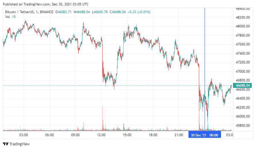 Биткоин (BTC) начал четверг с коррекции. По состоянию на 06:06 (МСК), криптовалюта торгуется по $46 688. Минимум стоимости биткоина за 24 часа, по данным ресурса CoinMarketCap, зафиксирован на уровне $45 896, максимум – на высоте $48 119.