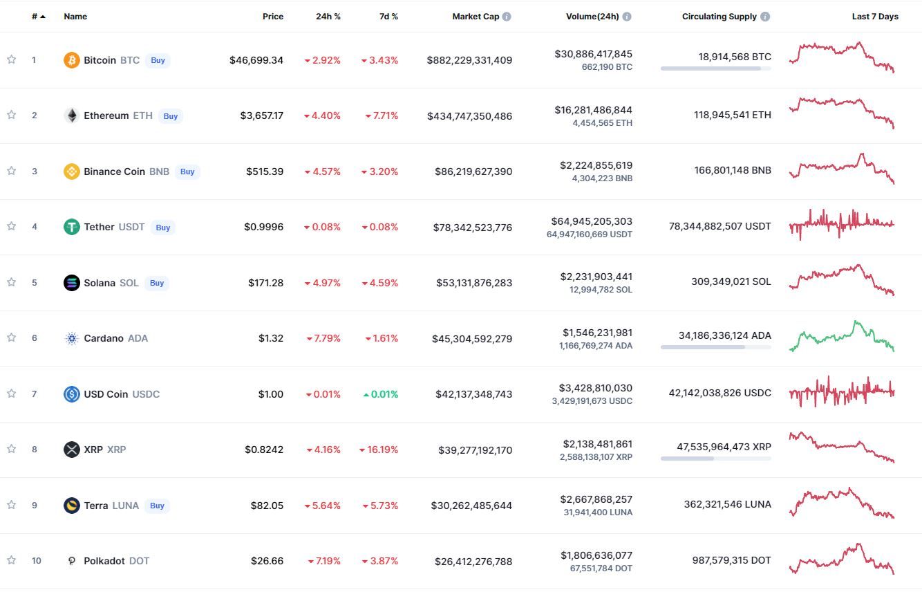 В топ-10 самых капитализированных криптовалют все монеты, за исключением USD Coin, продемонстрировали отрицательную динамику движения в рамках суток и недели. Наибольшие потери за 24 часа зафиксированы у Cardano (-7,79%). В рамках недели активнее других терял в цене XRP (-16,19%).