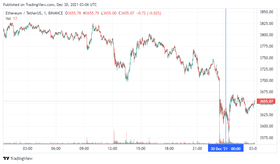 Вторая по капитализации криптовалюта Ethereum также начала день с коррекции. По состоянию на момент написания новости, монета торгуется по $3655.
