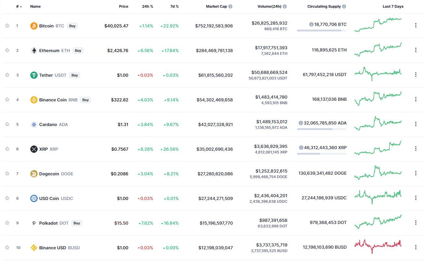 В топ-10 самых капитализированных криптовалют все монеты, за исключением стейблкоинов Tether, USD Coin и Binance USD, продемонстрировали позитивную динамику движения в течение 24 часов и последних 7 дней. Лучший результат за сутки (+8,28%) и неделю (+26,56%) зафиксирован у XRP.
