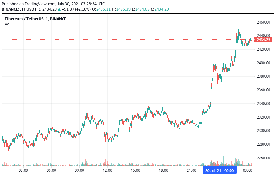 Вторая по капитализации криптовалюта – Ethereum – начала день с небольшого роста. По состоянию на момент написания новости, монета торгуется по $2434.