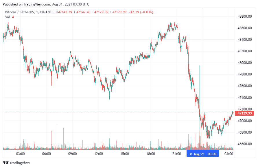 Биткоин (BTC) начал вторник с восстановления после падения накануне. По состоянию на 06:31 (МСК), криптовалюта торгуется по $47 129. Минимум стоимости биткоина за 24 часа, по данным CoinMarketCap, зафиксирован на уровне $46 750, максимум – на высоте $48 714.