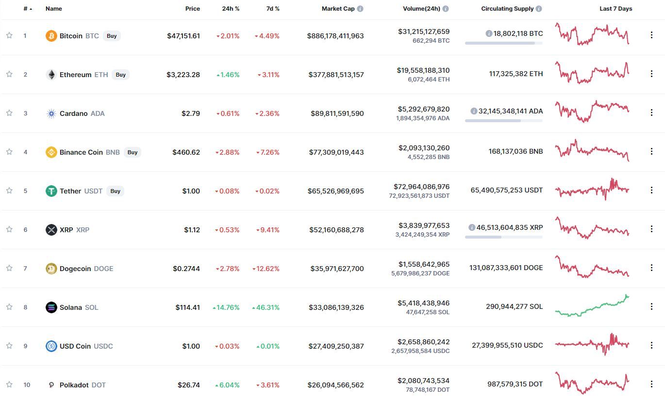 Большинство криптовалют из топ-10 рейтинга капитализации продемонстрировали отрицательную динамику движения в течение суток и недели. Лучший результат за 24 часа (+14,76%) и последние 7 дней (+46,31%) зафиксирован у Solana. Наибольшие потери за сутки продемонстрировал Binance Coin (-2,88%). В течение недели активнее других терял в цене Dogecoin (-12,62%).