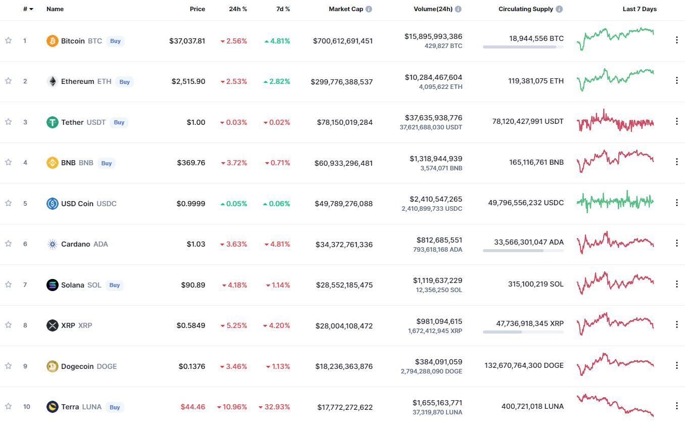 В топ-10 самых капитализированных криптовалют наибольшие потери за сутки (-10,96%) и неделю (-32,93%) зафиксированы у Terra. В рамках 24 часов все монеты, за исключением стейблкоина USD Coin, теряли в цене. В течение недели лучший результат зафиксирован у биткоина (+4,81%).