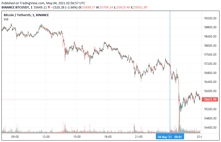 Биткоин начал вторник с падения. Еще вчера криптовалюта торговалась близ уровня $59 тыс. На момент написания новости (06:00 по МСК) курс биткоина находится на уровне $55 631.