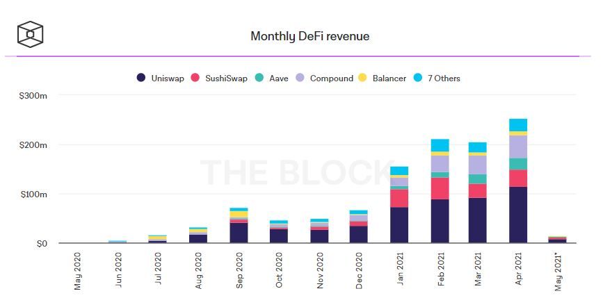- DeFi-протоколы показали рекордную доходность в апреле. По данным The Block, в прошлом месяце пользователи DeFi-протоколов сгенерировали $252 млн прибыли. Показатель оказался рекордным за всю историю рынка децентрализованных финансов.