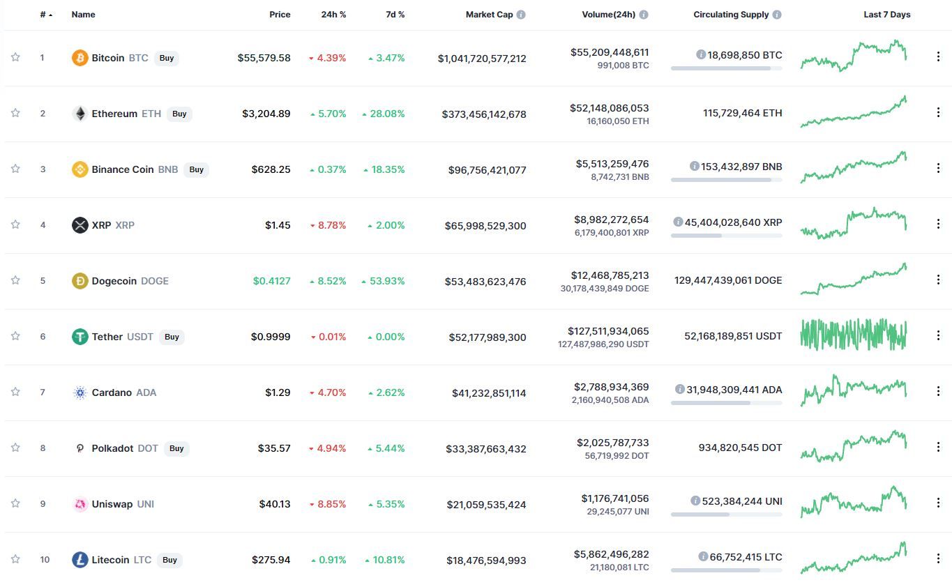 В топ-10 самых капитализированных криптовалют лучший результат роста за сутки (+8,52%) и неделю (+53,93%) продемонстрировал Dogecoin. Наибольшие потери в течение 24 часов зафиксированы у Uniswap (-8,85%). За последние 7 дней все криптовалюты из топ-10 рейтинга капитализации продемонстрировали позитивную динамику движения.