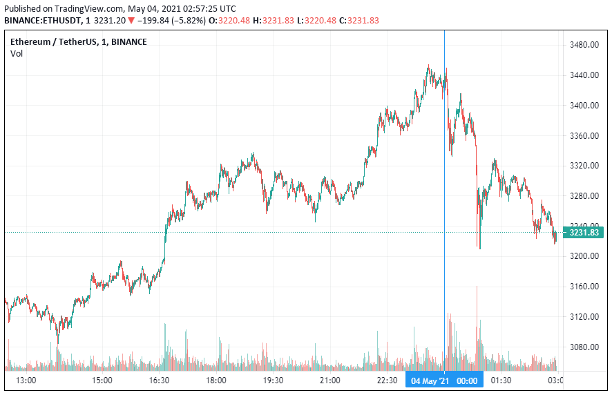 SponsoredВторая по капитализации криптовалюта – Ethereum – также начала вторник с падения. Около трех часов назад монета обновила абсолютный максимум на высоте $3450, после чего вышла в коррекцию. На момент написания материала ETH торгуется по $3231.