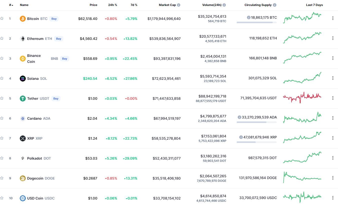В топ-10 самых капитализированных криптовалют лучший результат за 24 часа зафиксирован у XRP (+8,12%). В рамках недели активнее других рос Polkadot (+29,09%). Наибольшие потери за сутки зафиксированы у Dogecoin (-0,85%). В рамках недели все криптовалюты, за исключением стейблкоина Tether, продемонстрировали позитивную динамику движения.