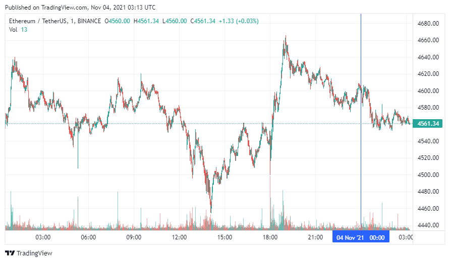 Вторая по капитализации криптовалюта – Ethereum – также начала день с бокового движения. По состоянию на момент написания новости монета торгуется по $4561. Максимум стоимости Ethereum зафиксирован около 8 часов назад на высоте $4664.