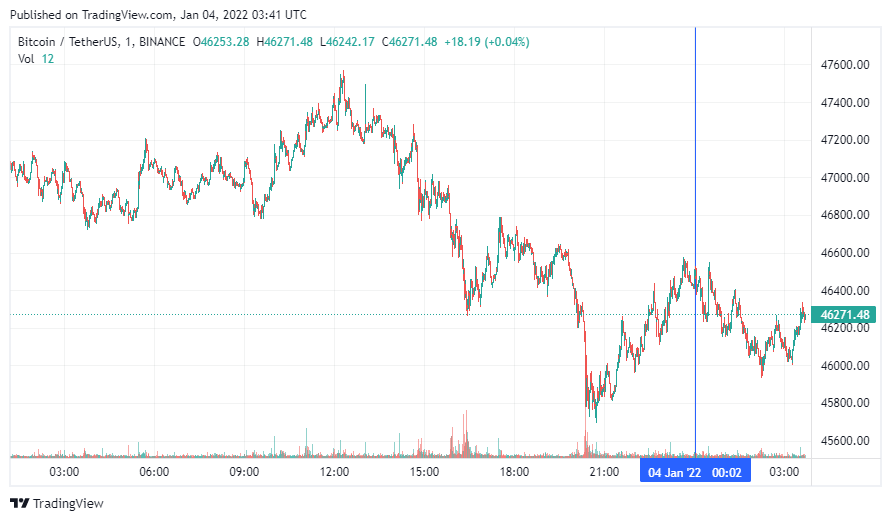 Биткоин (BTC) начал вторник с коррекции. По состоянию на 06:43 (МСК), криптовалюта торгуется по $46 271.