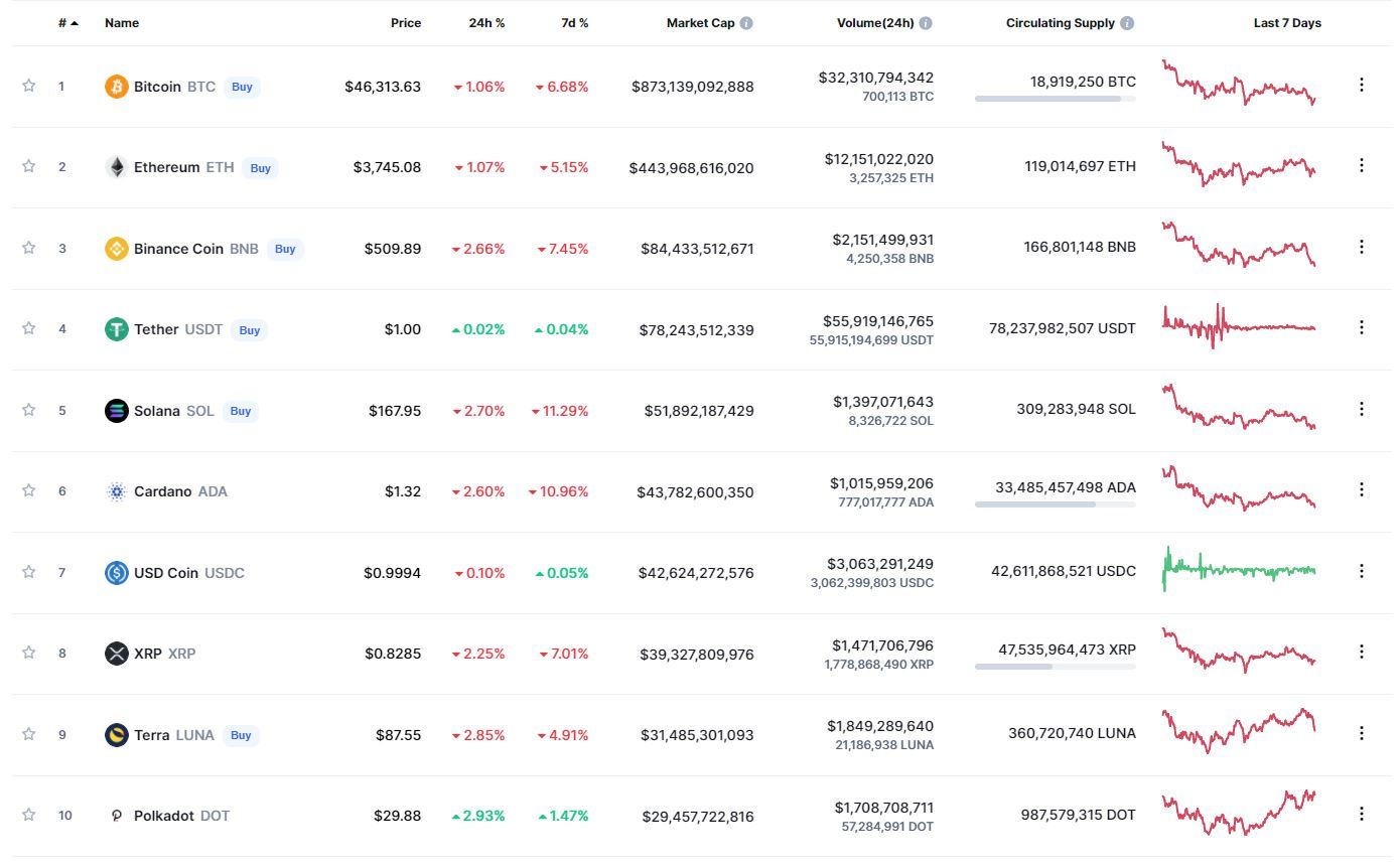 В топ-10 самых капитализированных криптовалют лучший результат за сутки (+2,93%) и неделю (+1,47%) зафиксирован у Polkadot. Активнее других в течение 24 часов терял в цене Terra (-2,85%). Наибольшие потери за неделю зафиксированы у Solana (-11,29%).