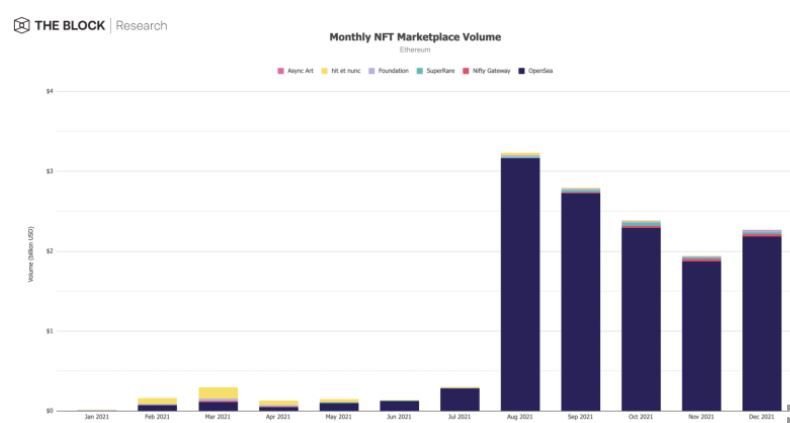 - Торговый объем NFT на маркетплейсах, построенных на базе Ethereum. в декабре 2021 года прорвал четырехмесячный даунтренд. На это указывают данные аналитиков The Block.