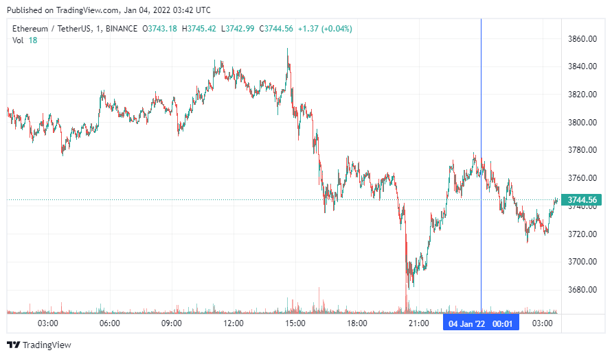 Вторая по капитализации криптовалюта Ethereum также начала вторник с коррекции. По состоянию на момент написания новости, монета торгуется по $3744.