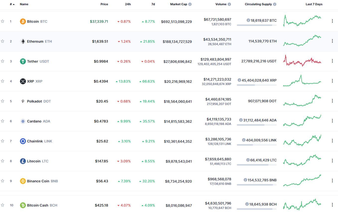 Многие криптовалюты из топ-10 рейтинга капитализации ресурса CoinMarketCap завершают рабочую пятидневку падением. Биткоин, по состоянию на 06:33 (МСК), торгуется по $37 339. За сутки криптовалюта потеряла 0,87% стоимости, сохранив, при этом, позитивную динамику в течение недели (+8,77%).