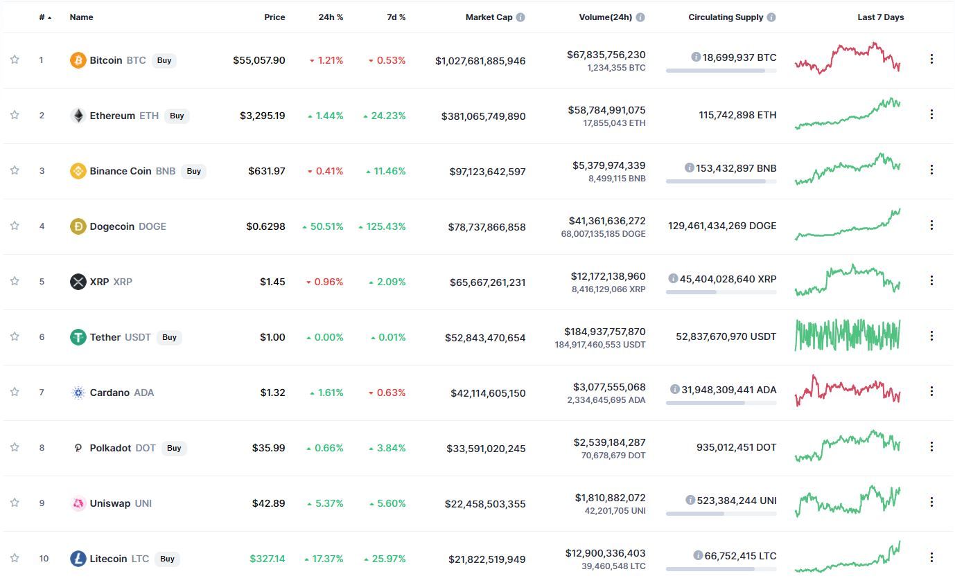 В топ-10 самых капитализированных криптовалют лучший результат за 24 часа (+50,51%) и неделю (+125,43%) продемонстрировал Dogecoin. Одним из поводов для роста криптовалюты стал твит CEO популярной биржи Binance Чанпена Чжао. Наибольшие потери за сутки среди первой десятки цифровых активов зафиксированы у биткоина (-1,21%). В течение недели активнее других из топ-10 терял в стоимости Cardano (-0,63%).