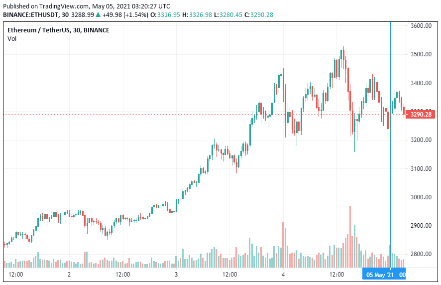 Вторая по капитализации криптовалюта – Ethereum – в очередной раз обновила максимум. На этот раз пик зафиксирован на высоте $3523 (около 14 часов назад, по данным ресурса CoinMarketCap). На момент написания новости, монета торгуется по $3290.