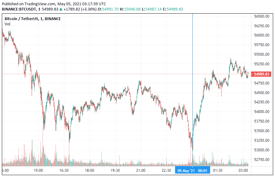 Среда началась для биткоина с роста, после падения вчера вечером до уровня $53 тыс. По состоянию на 06:18 (МСК), криптовалюта торгуется по $54 989.