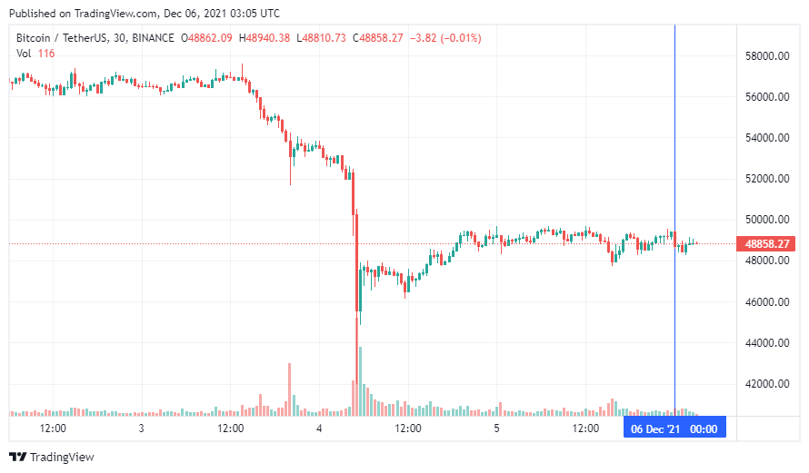 Биткоин (BTC) начал новую рабочую неделю с падения. По состоянию на 06:06 (МСК), криптовалюта торгуется по $48 858. Минимум стоимости биткоина за 24 часа, по данным CoinMarketCap, зафиксирован на уровне $47 857, максимум – на высоте $49 743. На выходных криптовалюта опускалась до $42 874.