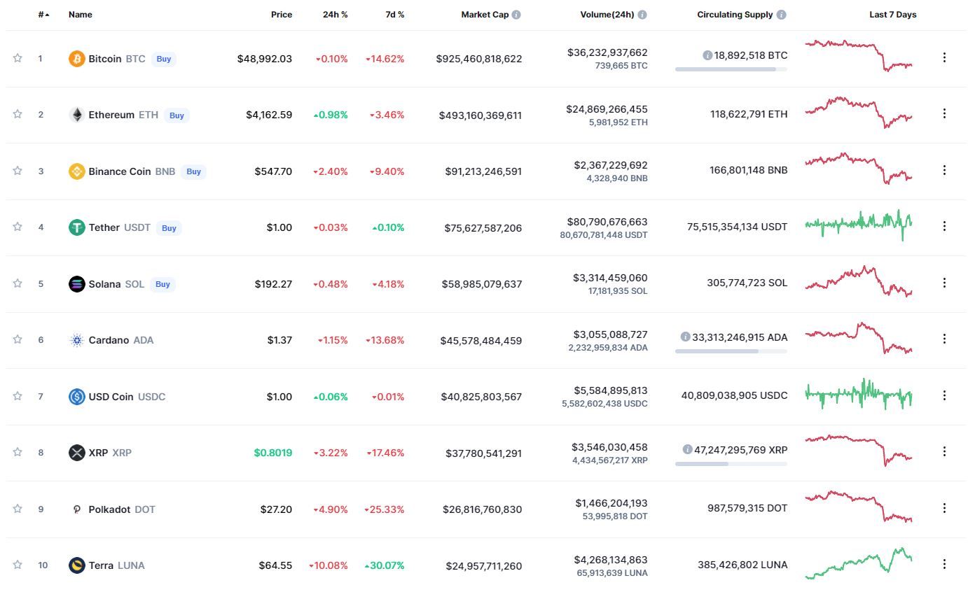 В топ-10 самых капитализированных криптовалют появилась новая монета – Terra. У цифрового актива зафиксированы наибольшие потери за 24 часа (-10,08%). При этом Terra продемонстрировала лучший результат роста в топ-10 (+30,07%) за неделю. В рамках суток активнее других рос Ethereum (+0,98%). Наибольшие потери зафиксированы у Polkadot (-25,33%).