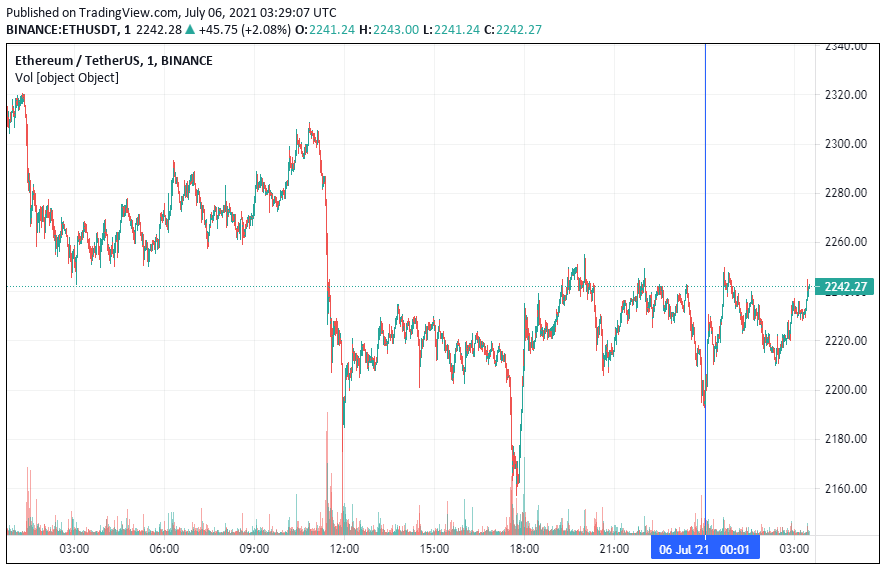 Вторая по капитализации криптовалюта – Ethereum – начала день с бокового движения. По состоянию на момент написания новости, монета торгуется по $2242.
