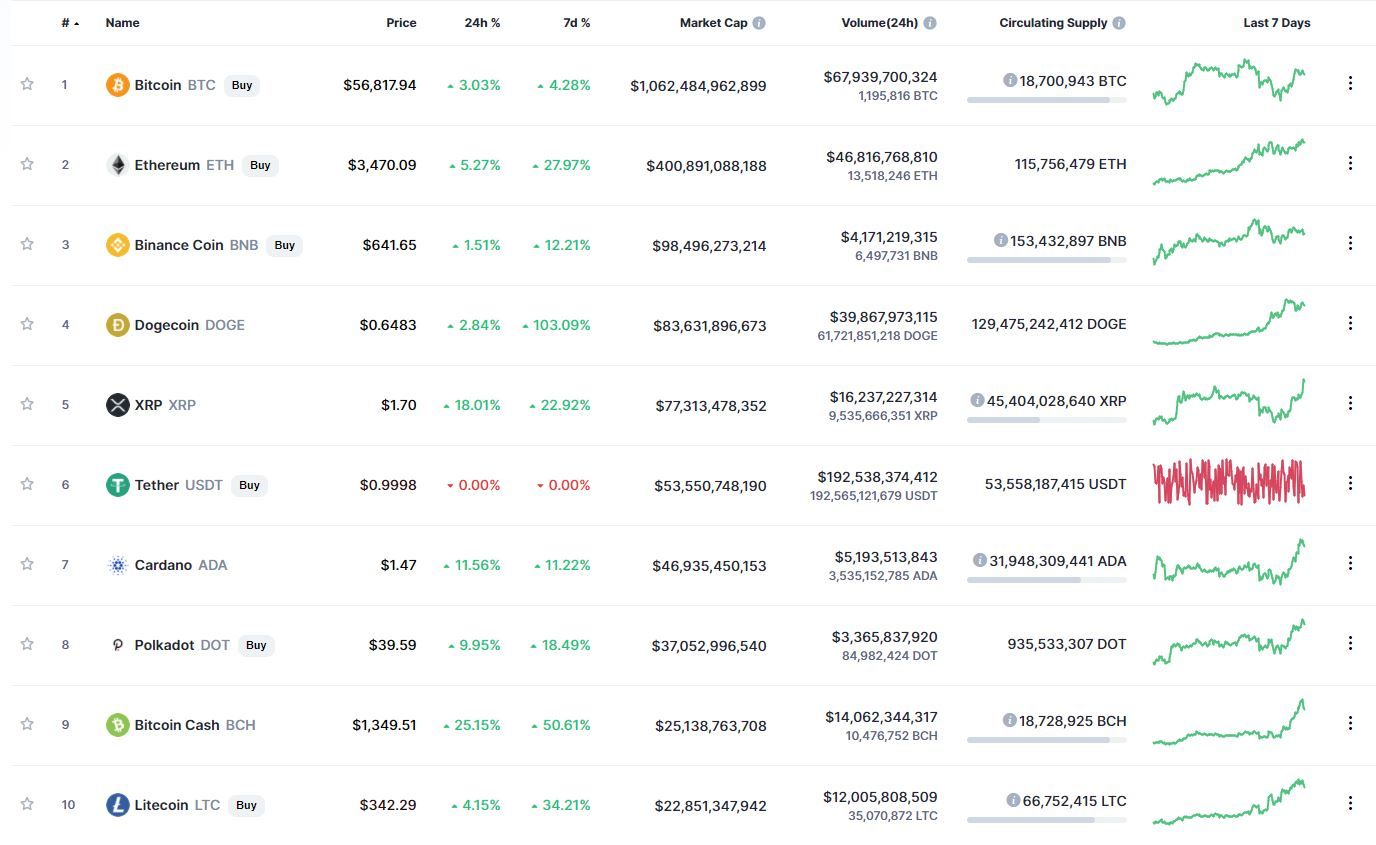 В топ-10 криптовалют лучший результат роста за 24 часа продемонстрировал Bitcoin Cash (+25,15%), за неделю – Dogecoin (+103,09%). Все криптовалюты в первой десятке капитализации сохранили позитивную динамику движения в течение суток и последних 7 дней.