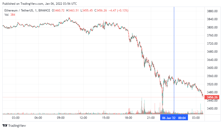 Вторая по капитализации криптовалюта Ethereum также начала день с падения. По состоянию на момент написания новости, монета торгуется по $3456. В моменте криптовалюта опускалась до $3415.